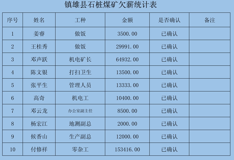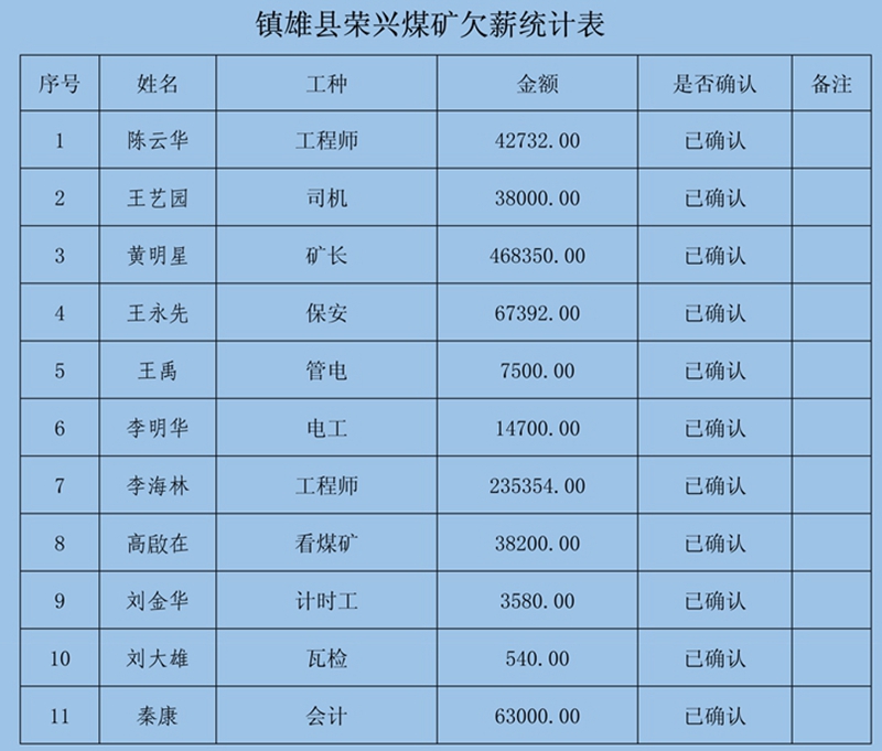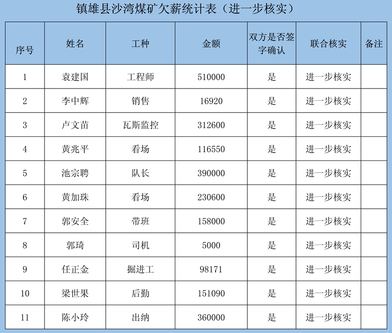 2、本次登記情況:經(jīng)初核確認(rèn),累計共收到12條欠薪申報,涉及12人1595830元;煤礦方已簽字蓋章確認(rèn)8條,涉及8人413830元。