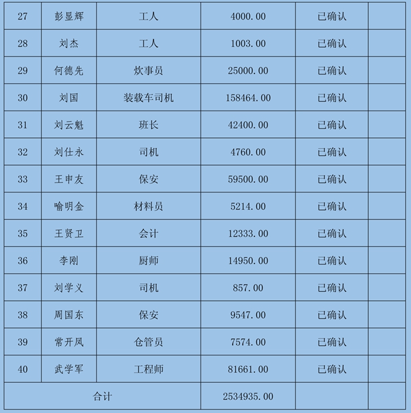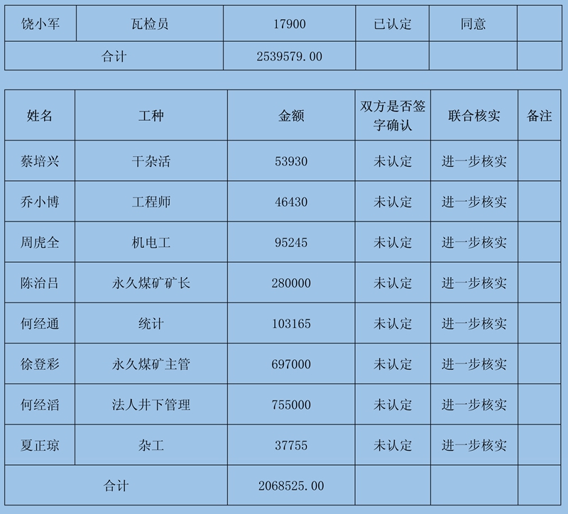 2、本次確認(rèn)情況:經(jīng)初核確認(rèn),累計共收到41條欠薪證據(jù),涉及41人2539579元;勞資雙方已簽字蓋章確認(rèn)30條欠薪證據(jù),涉及30人360444元;煤礦方未簽字確認(rèn)11條欠薪證據(jù),涉及11人2179135元。