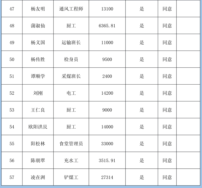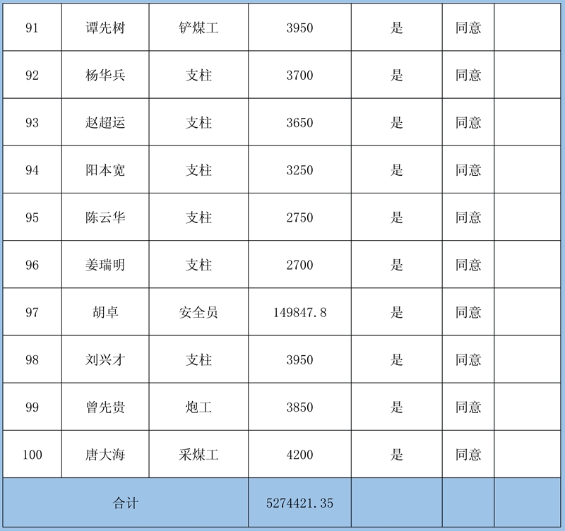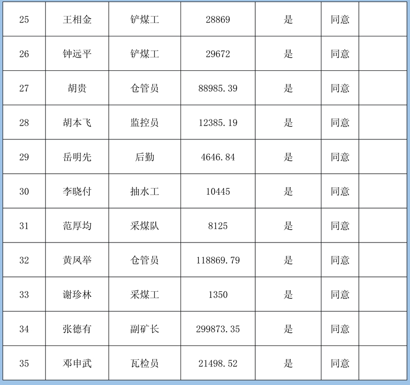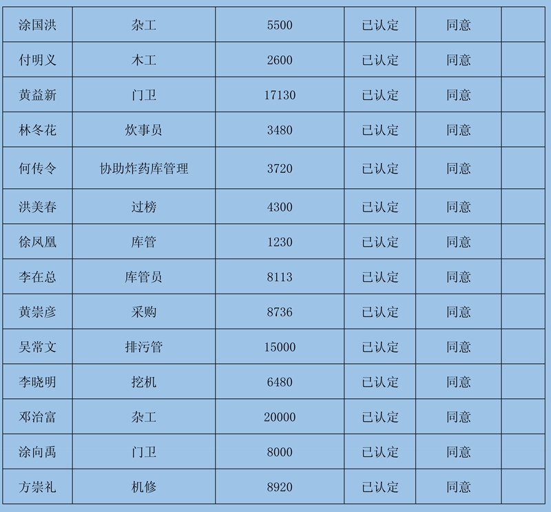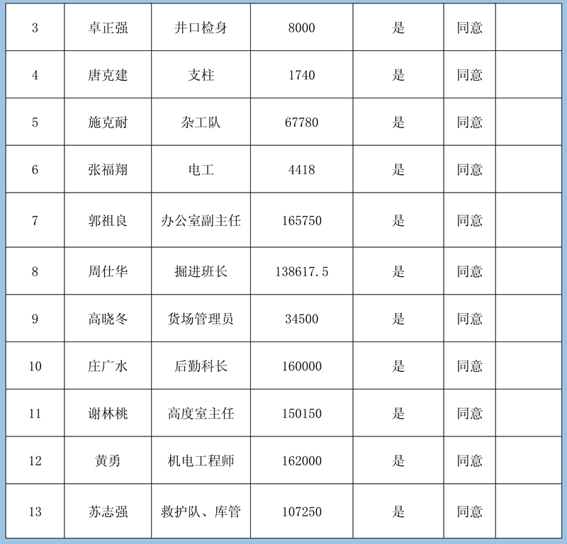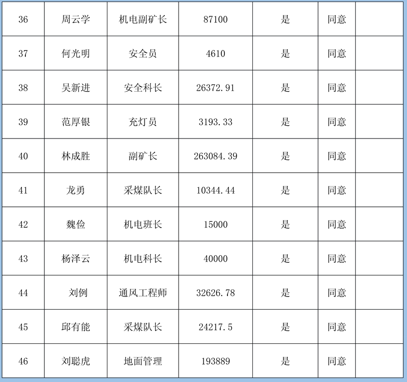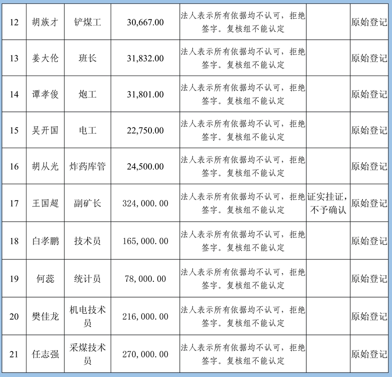 4、復(fù)核意見:建議予以確認(rèn)申報8條金額413830元;需調(diào)查核實再行確認(rèn)3條牟全書、牟全松和白啟波三人的申報,當(dāng)事人未提供切實欠薪依據(jù),礦方亦不認(rèn)可;不予確認(rèn)1條劉永泉申報的欠薪經(jīng)核實為煤礦轉(zhuǎn)讓金。