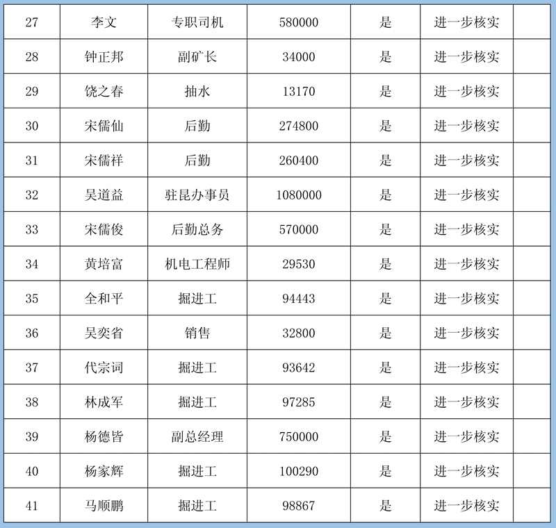4、復(fù)核組意見:①煤礦管理方新提交的5份5人627萬元欠薪資料因證據(jù)不足暫緩確認(rèn);②羅克雄1415434元雖然提供的證據(jù)充足,但由于他是公司的總經(jīng)理且金額較大,需要再次確認(rèn);③其他40條欠薪證據(jù)屬實,涉及40人2534935元可以確認(rèn)。