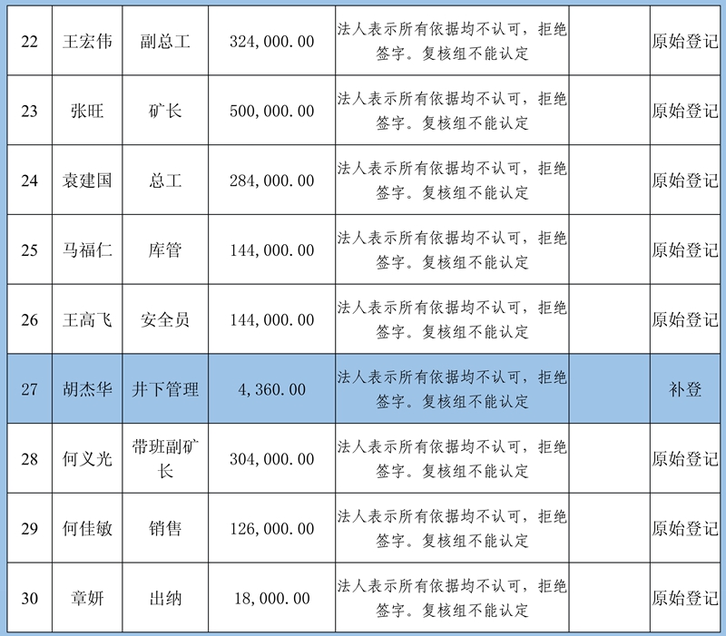 4、復(fù)核意見:煤礦方現(xiàn)法人以所有欠薪依據(jù)無法核實為理由拒絕簽字認(rèn)可所有欠薪申報。不予確認(rèn)兩條(王國超申報工資324000元屬掛證費用,張為民法人工資9066600元);其余135條申報因煤礦方原因暫不能確認(rèn)。
