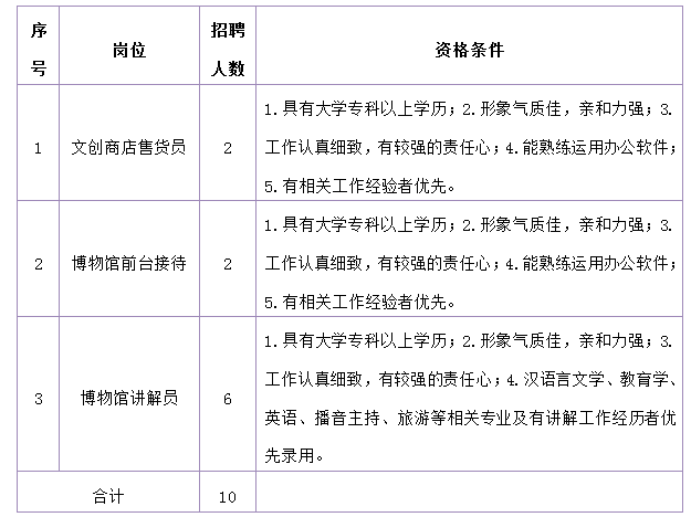 本次共招聘10名。其中,文創(chuàng)商店售貨員2名,博物館前臺(tái)接待2名,博物館講解員6名。應(yīng)聘人員在符合招聘基本條件基礎(chǔ)上,需符合以下相關(guān)崗位資格條件。具體崗位條件如下: