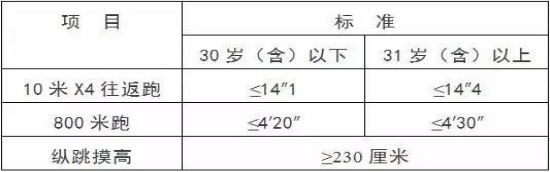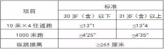 體能測試參照《公安機(jī)關(guān)錄用人民警察體能測評項(xiàng)目和標(biāo)準(zhǔn)(暫行)》進(jìn)行。具體標(biāo)準(zhǔn)如下: