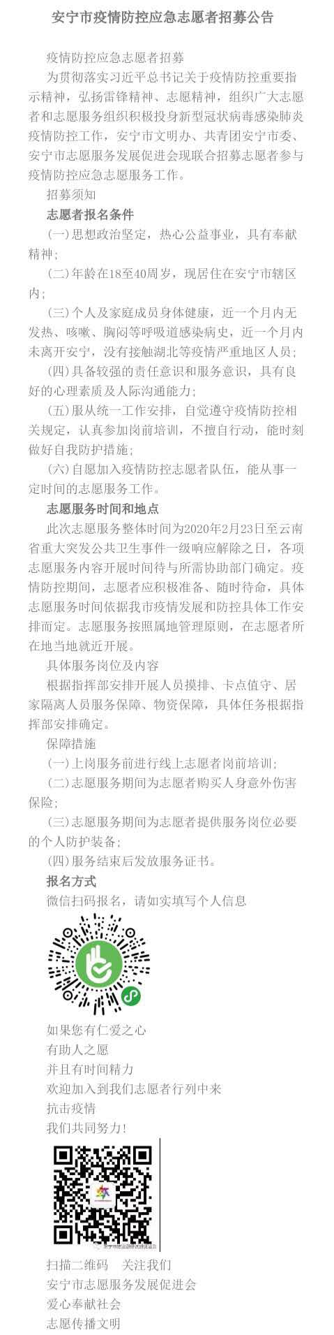 安寧市疫情防控應(yīng)急志愿者招募