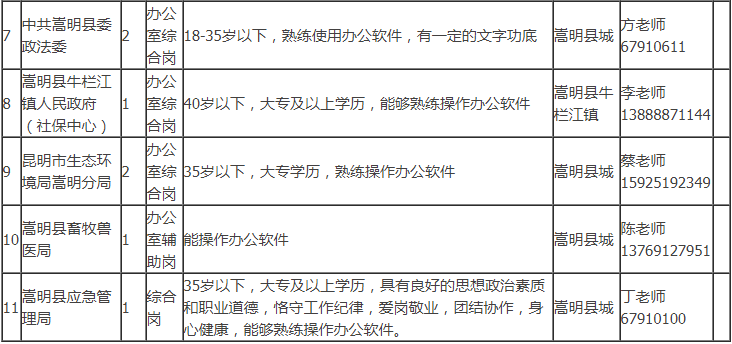 招聘具體事宜請(qǐng)咨詢用人單位。符合公益性崗位上崗條件的個(gè)人也可以到嵩明縣勞動(dòng)就業(yè)服務(wù)局綜合科申請(qǐng)公益性崗位求職登記,詳詢陳老師:0871-67917444。